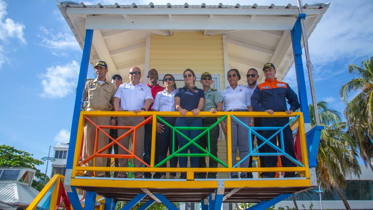 En aras de continuar garantizando la seguridad de los bañistas en los balnearios del centro de la isla, el Gobernador (e) del Departamento Juan Francisco Herrera Leal y el equipo de funcionarios de la administración encabezados por la Secretaría de Turismo Yadira Olivo Flórez y el comandante del Cuerpo de Bomberos de San Andrés Willie Gordon, hicieron la inauguración de las torres para salvamento en las playas Sprat Bight.